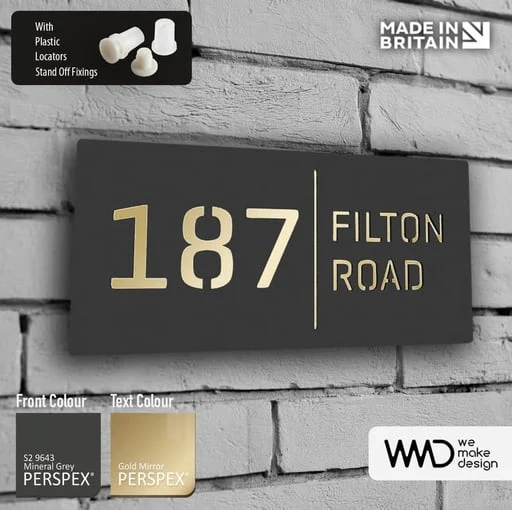 Give the front of your home a stylish, modern update with this sleek, laser-cut acrylic house sign. Crafted from two layers of precision-cut acrylic, the contrasting back panel shines through the front letter cutouts, creating a striking visual effect. The hidden standoff fixings on the back make the sign appear to float 2 cm away from the wall, adding a touch of elegance. For easy installation, the sign comes with detailed fitting instructions, a template, screws, and wall plugs included.